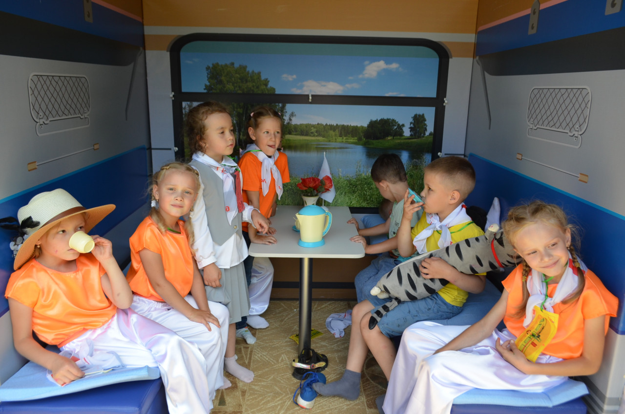 Праздник стартовал с семи часов утра, зазвучала веселая музыка, ребят встречали клоун и проводница, они раздавали билеты на поезд.