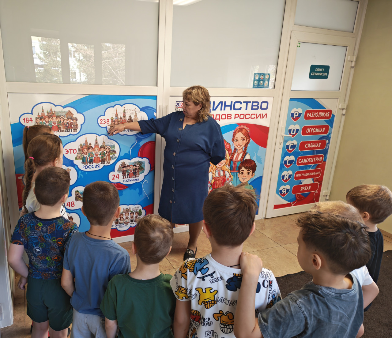 У входа в четвёртый блок нашего детского сада оформлен целый уголок — стена, посвящённая Году единства народов. Это не просто яркое оформление, а уникальная возможность для детей в игровой и наглядной форме познакомиться с культурой, традициями и ценностями единства.