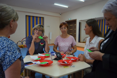 установочный педсовет прошел в виде творческой гостиной «Арбузник». Мероприятие стартовало с прослушивания Гимна России, просмотра видеоролика о нашей великой и могучей Родине! На повестке дня стояли пункты и «Итоги реализации плана летней оздоровительной работы», и «Обсуждение и утверждение годового плана работы учебного года», и «Важные новости». Педагоги представили свои презентации и видеоролики о проделанной работе «Игрушки антистресс», «Наш веселый огород», «Говорящая среда», «Нескучные игры». Далее озвучили годовые задачи на учебный год, потом прошло утверждение Основной Программы ДО в соответствии с ФОП ДО. Мастерская с удивительными мастер-классами расположилась в физкультурном зале, это была удивительная локация творчества и обмена опытом. Коллеги предложили смастерить «Капитошек» из шариков и сыпучих продуктов, веера и красивые закладки из сочных арбузных цветов. Закончили педсовет по традиции рефлексией на прекрасных «арбузиках» педагоги писали свои пожелания и напутствия на новый учебный год!